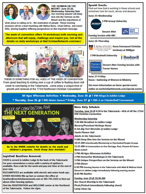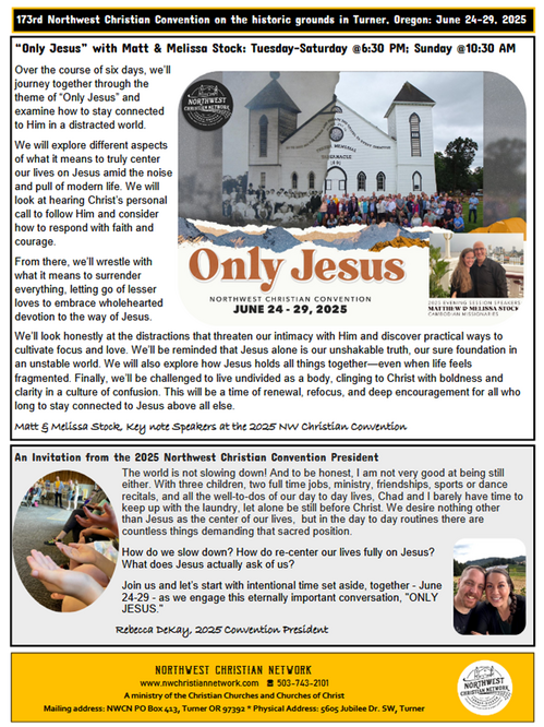 We will be joining other Christians for worship at the Northwest Christian Convention on Thursday evening, June 26th at 6:30 pm and on Sunday, June 29th at 10:00 am in the Tabernacle. There will not be any meetings or services at the TCC building on those two days.
